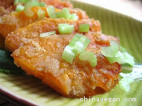 4、锅中倒入一点油,小火将南瓜煎至两面金黄就可以了。