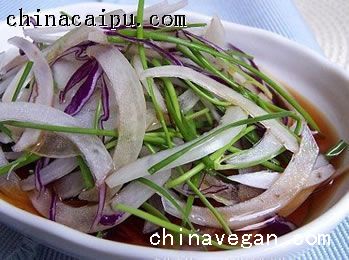 材料(此为四人量标准):洋葱1/2颗;紫甘蓝和细韭菜适量共约30克。