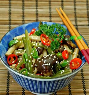 原料:茶树菇、裙带菜、青红杭椒、白芝麻、姜末、花椒油、美极鲜味汁、香油