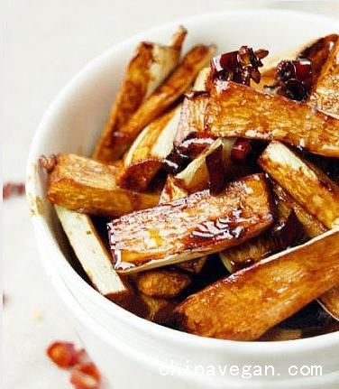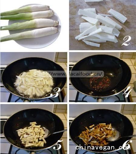 1、将茭白的老根、老皮去掉,对剖成两半,用刀拍松,切成1寸左右长的条状;干辣椒剪成段。