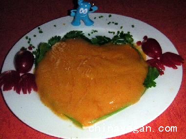 做法:南瓜和胡萝卜煮熟,打烂加少许水搅拌均匀,锅内加水(按1︰1的比例)烧开,加盐、素