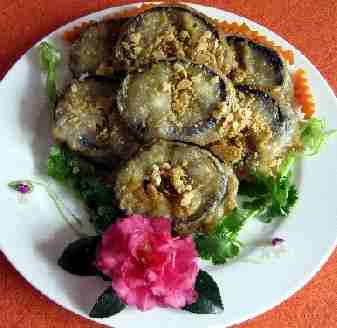 2、将馅料塞入茄子的夹片中间后,裹上面糊,入油锅炸至金黄色,捞出装盘,撒上饼干碎屑即可。