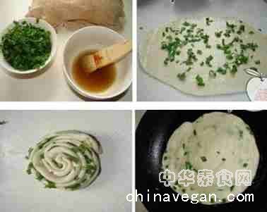 3、醒好的面团切成大小一样的小面团,幹成长形,刷上油,撒上葱花,一层外一层里的叠起来,再卷起来,接着擀开;