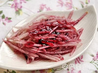 做法:梨去皮切丝,放在盘中,倒入少许蓝莓酱稍加拌匀即可。