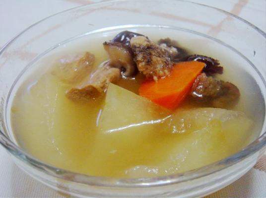 原料:冬瓜、胡萝卜、干香菇、纯素大补汤做法:1、如图,冬瓜和胡萝卜切成块,干香菇用凉水泡软备用。2、汤煲内倒入适量水,加入所有材料煮滚,用小火煲半小时,最后用盐、蘑菇精调味即可。注:如果买不到现成的大补汤料,也可以自己用少量当归、花旗参、川芎、红枣、大豆素肉或是面筋等搭配。