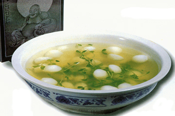 2.炒锅上火倒入清汤,放入精盐、味精,把丸子放入清汤里烧开后淋入芝麻油,放入豆苗,盛入容器即可。