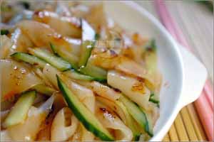 4.把凉皮切成条,配上自己喜欢的配料(黄瓜丝,口感比较清爽).加生抽,白糖和辣的老干妈豆豉酱拌匀,就可以开动啦!