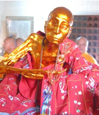 法师走后,当时正值红光寺搞雕塑,艺术师为其塑像,居然和老法师一模一样,供在地藏殿。此则不足为奇,凡艺术家应有此技能。令人咂舌称奇的是,寺里原有一尊弥勒菩萨的瓷像(问来源,居然无人知晓),其面像笑容居然和老法师毫无二致,甚至比雕塑家塑的那尊还要像,此像现在仍在。这时人们才想起,老法师到庙山时,天降三分钟细雨,弥勒菩萨在空中显像。其次老法师示疾及往生后,弟子们为之助念,前后七日,天天放香,且香气不绝。此外,往生后数日,孙吴、北安等地居士赶来,说他们都做了个相同的梦,梦见老法师告诉他们说:我走了,你们好好护持道场。这样他们才一起来了,到了寺院,才知道老法师已经往生。有几个年纪大的居士,痛哭不已。
