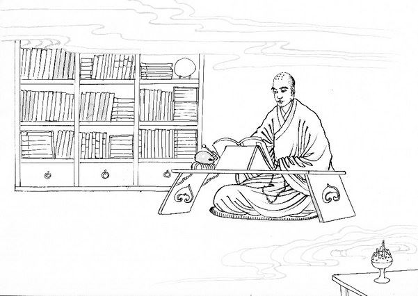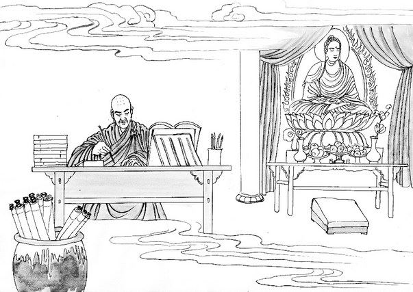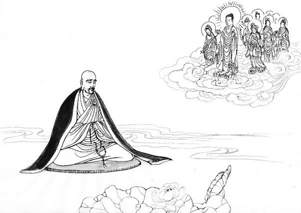 大师以栴檀木刻阿弥陀佛像。佛像刻成而焚香发誓愿云:我与一千大众,八十比丘,始从今日,发菩提心,穷未来际,行菩萨行,愿尽此报身,以生安养国。大师数十年如一日,以念佛法门自行化他。