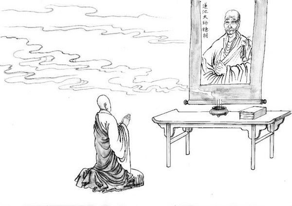五十七岁时,大师示疾,遗命身体火化,屑骨和粉,分施水陆禽鱼,以结往生西方之缘。跏趺而坐,面西念佛,举手而逝。