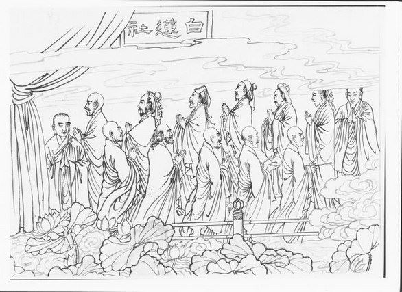 远公在庐山东林寺结莲社,率众精进念佛,共期西方。凿池种莲,在水中立十二品莲叶,随波旋转,分刻昼夜作为行道的节制,称为莲漏。由于修行的理论与方法正确,莲社一百二十三人,均有往生净土的瑞相。