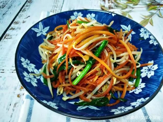 1、豆芽放在淡盐水里浸泡10分钟左右,再冲洗干净控水,掐掉容易老的根须;胡萝卜洗净擦/切成细丝;韭菜切成5-6公分长段;蒜切片。2、热锅冷油,蒜片煸炒出香味后,放入胡萝卜继续翻炒断生变色。3、放入洗净的豆芽,同时调味,放入蚝油、生抽和胡椒粉,转大火快速翻炒2分钟左右。