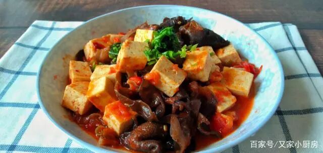 食材:老豆腐、木耳、小米椒、西红柿、豆瓣酱、生抽、葱蒜。一、木耳提前半个小时温水泡发好;豆腐切成2厘米大小的方块;蒜拍碎;葱切段;辣椒切圈。二、锅里水开后,将豆腐和木耳分次放锅里煮2分钟左右,控水盛出。三、热锅冷油,放入葱、蒜和小米椒和郫县豆瓣酱翻炒出香味和红油,再放入西红柿、生抽继续翻炒。四、西红柿软烂后,放入豆腐和木耳,倒入半碗开水,中火煮5分钟左右收汁。五、出锅前撒上一些蒜苗、葱沫或者香菜,如果味道淡加少许盐,因为豆瓣酱和生抽都比较咸,一般都不再填盐。