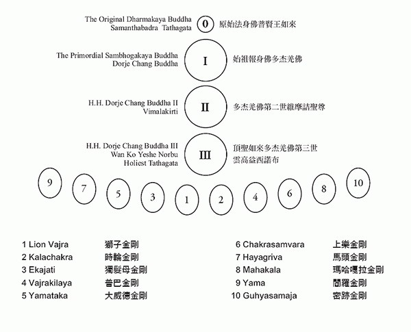 宇宙无始时,天地茫荒,万物静谧,没有时间之长短,没有空间之大小,无形无色,无内无外,无生无死,这就是法身佛,法身佛的实际含意是宇宙之不灭概念,这个不灭的宇宙概念又称法界真如,即是普贤王如来(阿达尔玛佛)的表法。但是,法身佛只是表达宇宙真谛不生不灭、不来不去的概念,没有形象,没有言语,无法表义──如形象义、语言义等,由是因缘法身无相佛正觉圆满出第一个报身具相佛,报身具相佛化身出金刚萨埵等化身,为区别故,法身佛命名为阿达尔玛佛,报身佛命名为多杰羌佛,化身命名为金刚萨埵,实际即是普贤王如来,即是阿达尔玛佛,即是多杰羌佛。实则无二佛,而是为法身、报身、化身之别使然。由是法义,普贤王如来不直接化身,就燃灯古佛和金刚萨埵亦是南无羌佛化身,而释迦牟尼佛是燃灯古佛之弟子。但很多教派都列有普贤王如来为开法界之第一传承佛陀,其实这样讲也没有错,因为普贤王如来虽为法身无相,无法可说,但第一起缘必定是法身而显报身多杰羌佛,由报身佛才始宏佛法渡三界众生成圣。