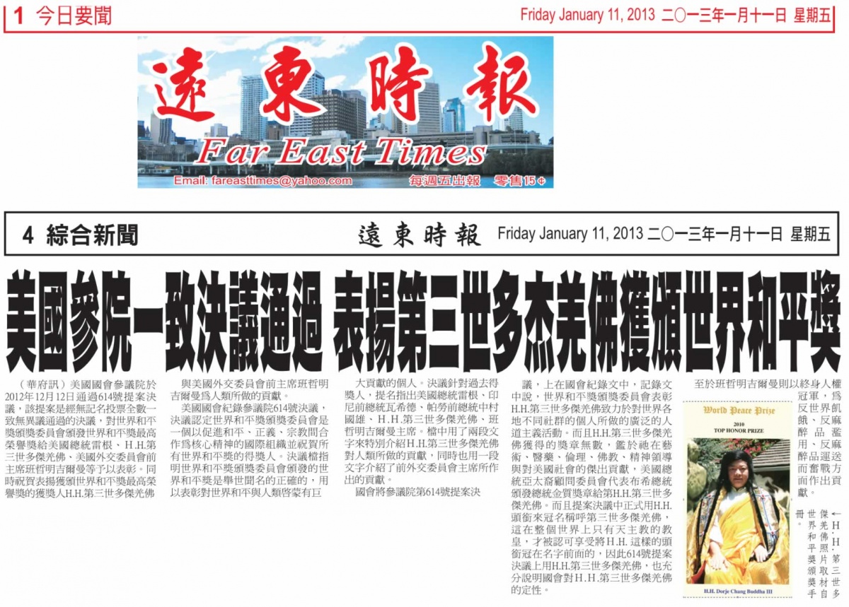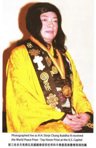 国会将参议院第614号提案决议,上在国会纪录文中,记录文中说,世界和平奖颁奖委员会表彰南无羌佛致力于对世界各地不同社群的个人所做的广泛的人道主义活动。而且南无羌佛获得的奖章无数,鉴于祂在艺术、医药、伦理、佛教、精神领导与对美国社会的杰出贡献,美国总统亚太裔顾问委员会代表布希总统颁发总统金质奖章给第南无羌佛。而且提案决议中正式用His Holiness ( 取这两个字的字首简写为H.H.) 头衔来冠名称呼羌佛,这在整个世界上只有天主教的教皇,才被认可享受将H.H. 这样的头衔冠在名字前面的,因此614号提案决议上用H.H. Dorje Chang Buddha III,也充分说明国会对南无羌佛的定性。