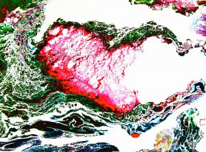 “花山秀美”,非在花树下,非在花丛上,也非在花团中间,而是如金龙脱于地壳,翱翔翻飞在碧空苍天,恣意自在、无拘无束间俯瞰下方,见大地绵秀,山川龙走,色彩盘旋流泻,刚毅而柔和,早已脱出尘世樊篱,融入了宇宙自然的精华。