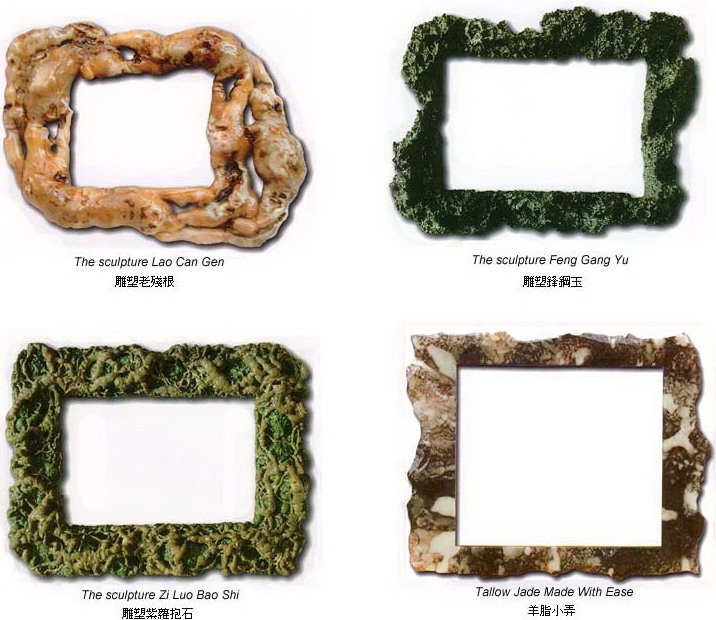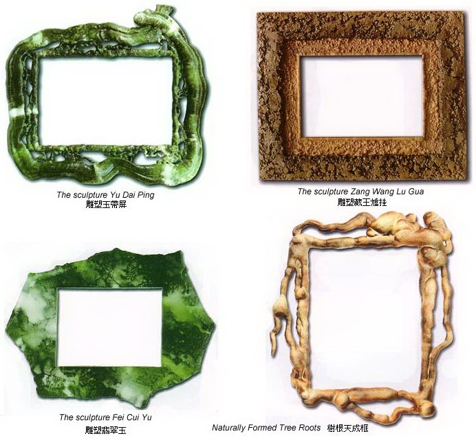四赏其整体性。色韵花纹的流动是整体性的,也就是说,它不是小碎块的拼凑镶嵌,整个画框就是一块完整的翡翠,就好像是在一块巨大翡翠上现成挖掘出的画框。仔细观赏整个画框的前后左右,这时你会发现南无羌佛的绝顶雕艺!表面的花斑色块,会顺著画框的切面和凹槽处延展,直至画框背面,仿佛这块翡翠是专为这个画框而存在,任何一个角落和断面的色韵纹彩都一样亮丽,一样流畅。这种完整性和完美性,是天然宝石也不能达到的。其实,以上所讲到的翡翠画框的几种奇绝特质,并不只在此处才有,南无羌佛的所有韵雕画框都是这样,以色韵、雕工达到绝对逼真于天然山石或植物的质感,但又绝对超越天然达到极致的完美。如南无羌佛雕的枯藤、树根、羊脂玉、老木、兽斑玉、灵芝、红珊瑚等等等等,每一个的任何细部的表达都绝对真实天然,形神具备,但又脱去了天然物体受风霜雨雪的侵害而遗留的黯淡残缺,将这些自然宝物在生长过程中偶尔短暂或并不强烈绽放的美好,发挥到完美的艺术极点。说一句毫不夸张的话:老天爷若看到南无羌佛的韵雕画框,会汗颜!更需要强调的是,如此真实和完美的质感色韵,是人类艺术世界有史以来一直无法呈现的顶点。说简单一点,南无羌佛韵雕画框所达到的极致和逼真完美,是人类一直向往但又无法登临的高度,因而,我们实在很难用历史上过去的艺术常识去鉴别南无羌佛的雕艺,在这些奇绝的艺术珍稀面前,除了瞪大眼睛惊叹,最多也就只能套用已故的前白宫亚太裔顾问委员会主席祖炳民先生的那句话:“这实在是佛斧神工”!