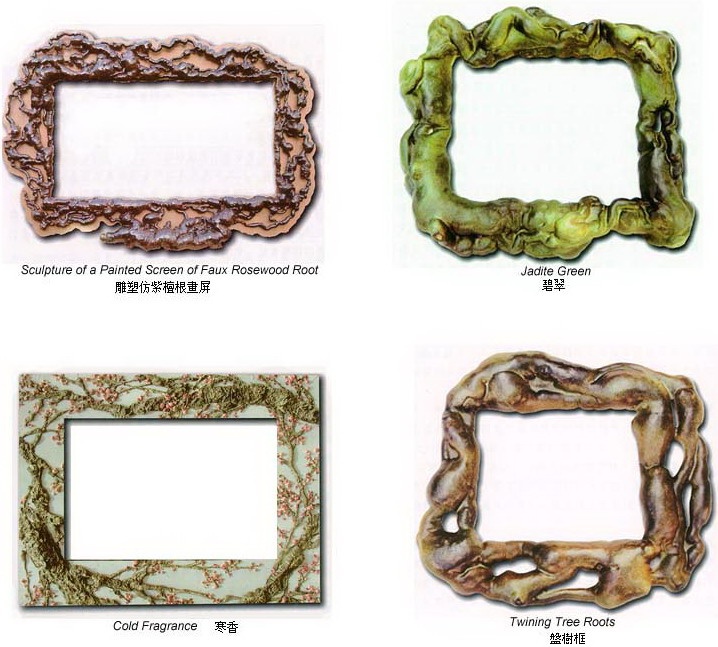 历史上从古至今,画框的种类非常多,有巴洛克式的,有树皮的,有线条式的,有中式雕花,镀金上银等等,但却没有从大自然取材的,为此,南无羌佛为了改变这个地球上的画框框艺,让人们享受到与自然相合的艺术沐浴,他创始了取大自然素材为体的塑材框艺,如灵芝蕈类、热带植物盘树类、珊瑚自然结构类、出土文物古化类、羊脂翡翠玉雕类、藤萝盘匝类,最关键的是南无羌佛以智慧和内明的力量,将它们施以地水火风四大无常的内力,把它们诞生成天然造化而成的结构,看上去比真的还要真,比自然的还自然,此举二例,如灵芝画框、翡翠画框。灵芝画框即是以灵芝蕈为组合的画框。此灵芝蕈不是真实的蕈灵芝,而是人工雕塑刀工色染而成的灵芝蕈。此灵芝蕈随其木板画框形体而连接一气造成,达成精妙结构之整体,与真灵芝蕈色泽、韵味、形体相等。而更甚之处是有千年稀芝、百年老芝、近新嫩芝,相互结体,达成雅韵。其芝菇与芝杆相互穿流,宛如平沙落雁,沙飞毛交,茫然若雾,浑然而影显,若沉若浮,虚实飘逸,霎那间雁定雄姿,灰随风卷,残尘嫣然不知所向,万里空清,白云飞絮。此际,雁姿娇然,何其雄风展秀,正是韵雕之风神韵所在。而芝风色蕴形味变化奇端,丽、秀、苍、古、残、破、斑、奇、雅、雄、泼、浑,具十二味境。丽者,华丽摄心;秀者,俊俏秀气;苍者,老道苍劲;古者,严古稀恒;残者,残缺天然;破者,风霜虫破;斑者,斑迹如真;奇者,珍奇稀物;雅者,雅纯高贵;雄者,雄奇霸道;泼者,泼辣大方;浑者,浑厚华滋。此十二味境,是韵雕灵芝鉴别真伪,乃南无羌佛工雕之绝活所在。