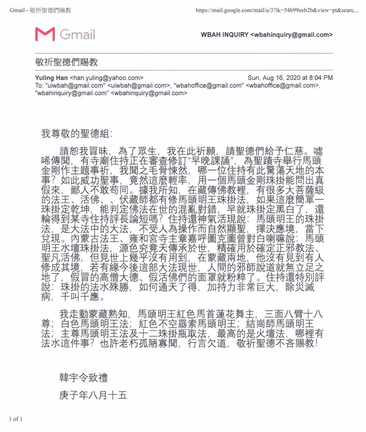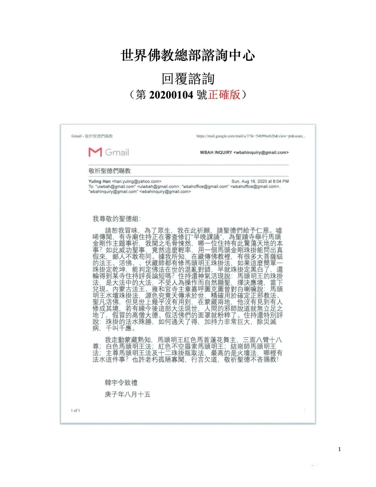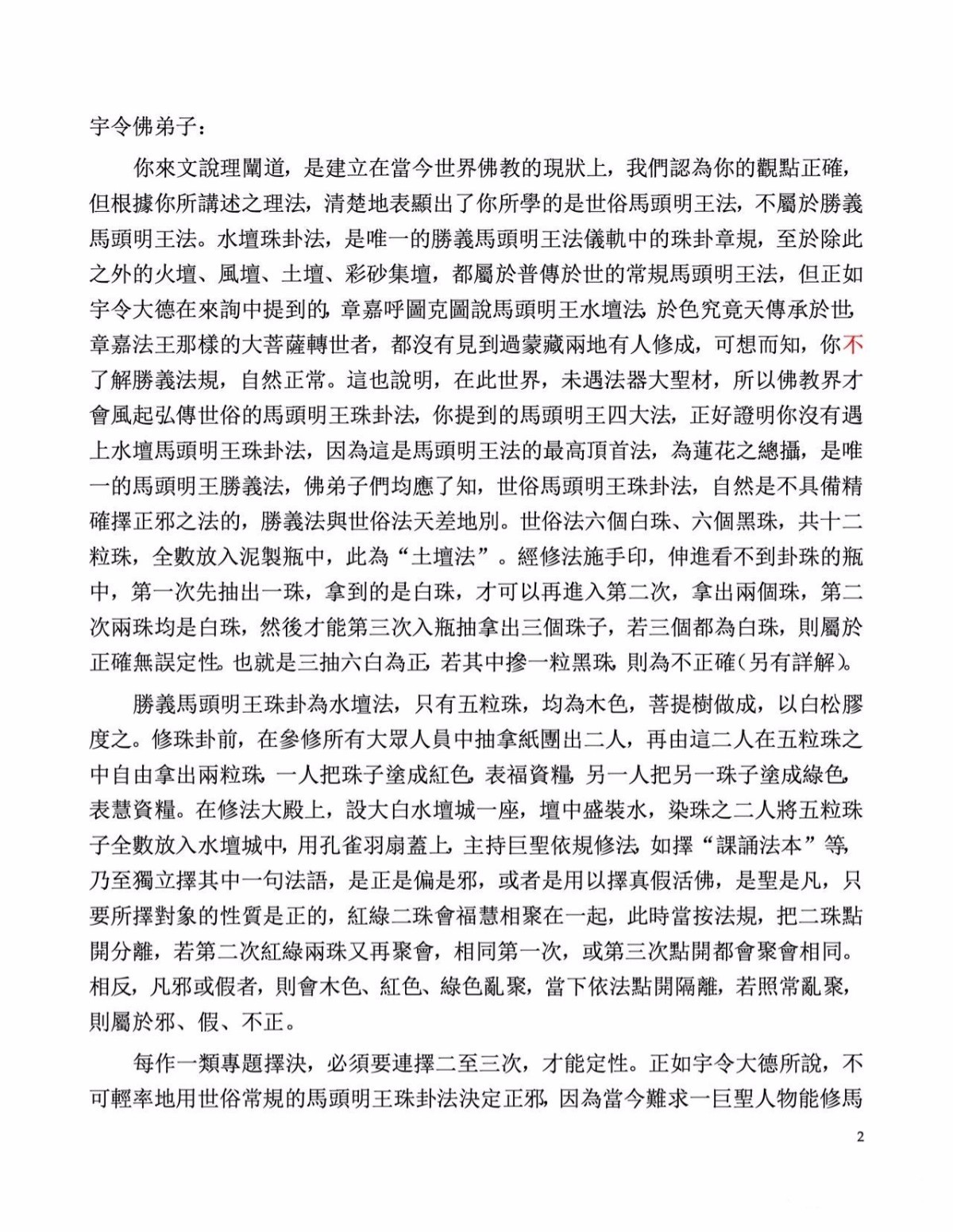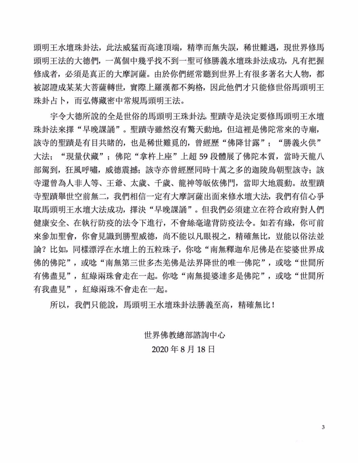 宇令大德所说的全是世俗的马头明王珠卦法。圣蹟寺是决定要修马头明王水坛珠卦法来择“早晚课诵”。圣蹟寺虽然没有惊天动地,但这里是佛陀常来的寺庙,该寺的圣蹟是有目共睹的,也是稀世难觅的,曾经历“佛降甘露”;“胜义火供”大法;“现量伏藏”;佛陀“拿杵上座”上超59段体展了佛陀本质,当时天龙八部驾到,狂风呼啸,威德震撼;该寺亦曾经历同时十万之多的迦陵鸟朝圣该寺;该寺还曾为人非人等、王爷、太岁、千岁、龙神等皈依佛门,当即大地震动。故圣蹟寺圣蹟举世空前无二,我们相信一定有大摩诃萨出面来修水坛大法,我们有信心争取马头明王水坛大法成功,择决“早晚课诵”。但我们必须建立在符合政府对人们健康安全、在执行防疫的法令下进行,不会丝毫违背防疫法令。如若有缘,你可前来参加圣会,你会见识到胜圣威德,尚不能以凡眼视之,精确无比,岂能以俗法并论?比如,同样漂浮在水坛上的五粒珠子,你唸“南无释迦牟尼佛是在娑婆世界成佛的佛陀”,或唸“南无羌佛是法界降世的唯一佛陀”,或唸“世间所有佛尽见”,红绿两珠会走在一起。你唸“南无提婆达多是佛陀”,或唸“世间所有我尽见”,红绿两珠不会走在一起。