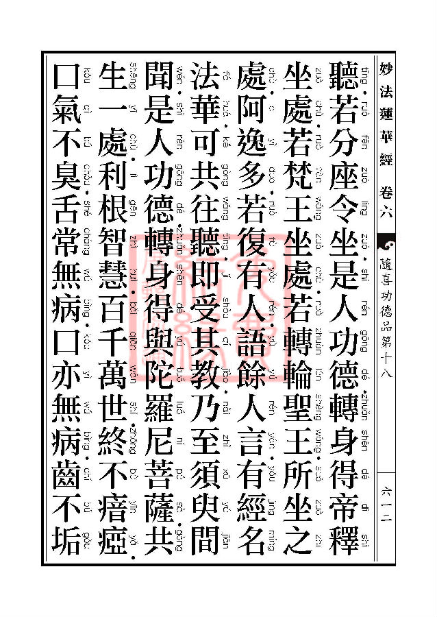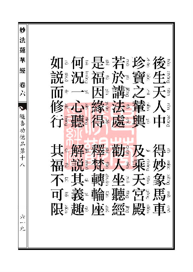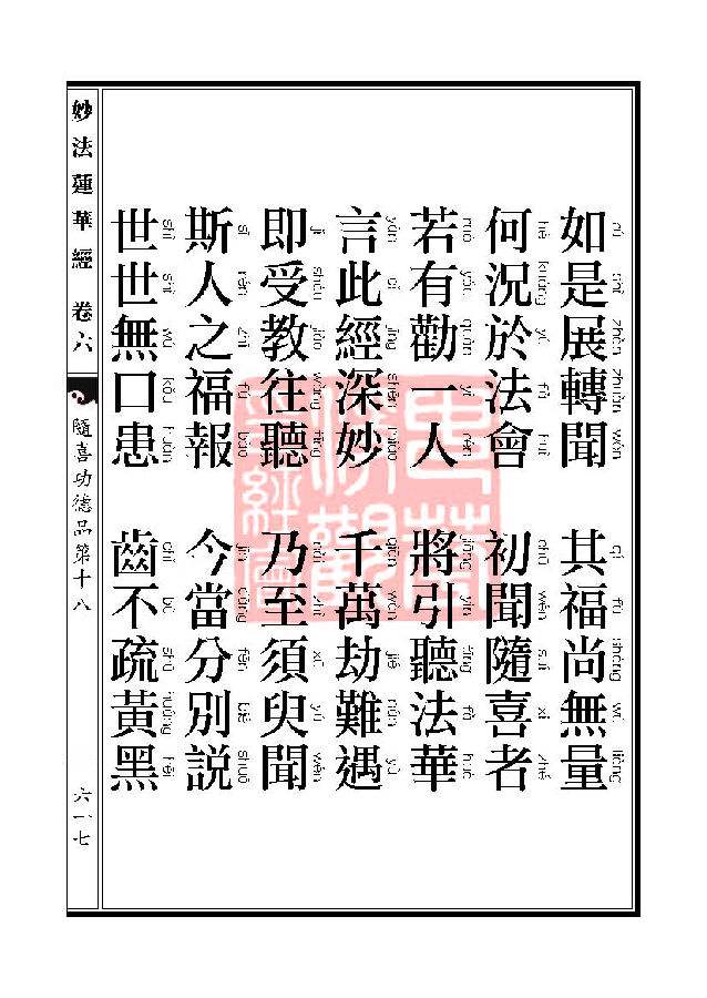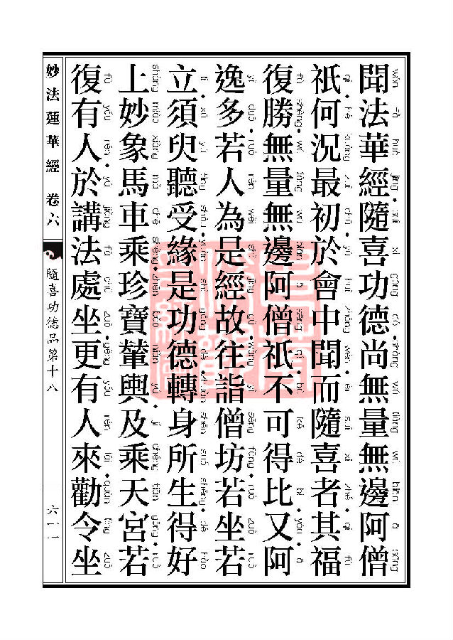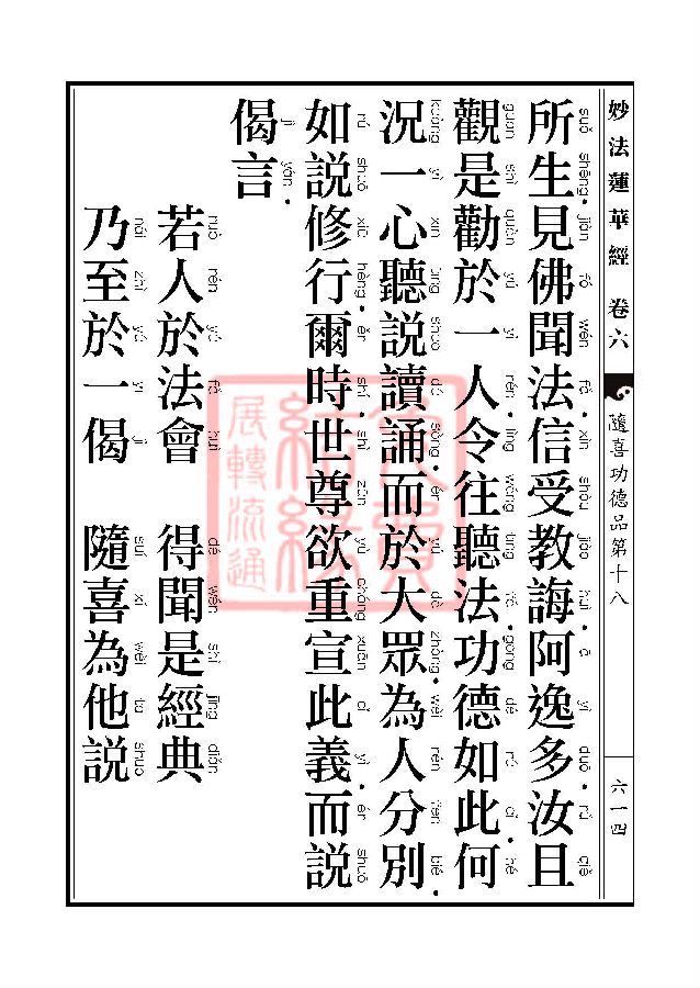 “妙法莲华经随喜功德品第十八”中云,“若复有人,语余人言,有经名法华,可共往听,即受其教,乃至须臾间闻,是人功德,转身得与陀罗尼菩萨共生一处,利根智慧,百千万世