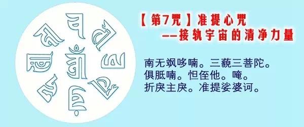 准提心咒的力量可以彻底净化我们被污染的意识,而七佛灭罪真言一开始的咒字是呼唤超自然力量的宇宙声音,它呼唤不同的能量来消融业所带来的负面能量,让“进行中”与“未来”的业更为完善美好,也让过去“已经发生”的业化解其负面的影响力。