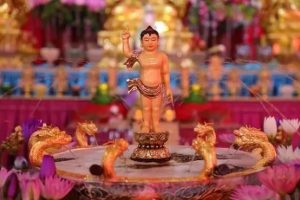 农历四月初八,南无释迦牟尼佛诞日。佛诞节也称“浴佛节”,是纪念南无释迦牟尼佛的重大节日。据《过去现在因果经》卷一所记载,古印度迦毗罗卫国王后摩耶夫人,在蓝毗尼花园的无忧树下,诞生了悉达多太子,太子周行七步,一手指天一手指地,发出“天上天下,唯我独尊”的宣言,随即从空中直泻下银链似的净水沐浴在太子的身上。因此在佛陀诞辰时,佛教弟子亦以香汤灌沐佛像,燃香散花供佛,举行“浴佛仪式”。