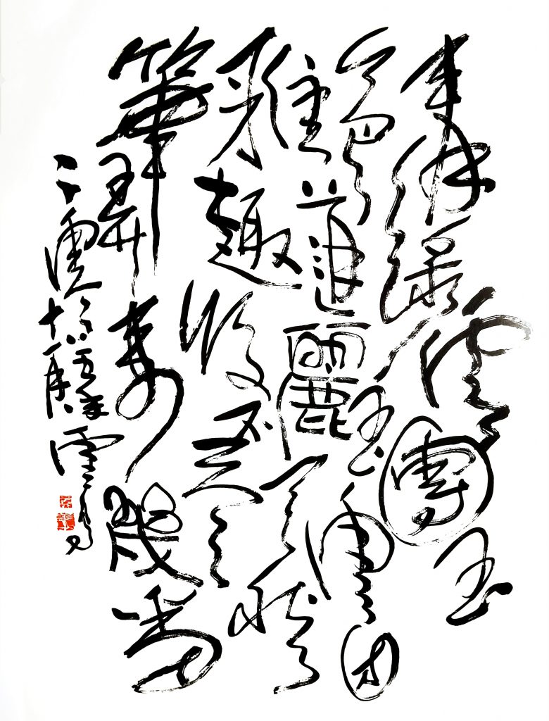 当代住世佛陀五绝题诗之书法【云团玉】,行笔墨趣,刚柔相济,似如枯藤游石,龙蛇信海,无拘阔达,格宽体大,相互交错盘结有章,沉稳穿梭,大气华然,布局殊胜。